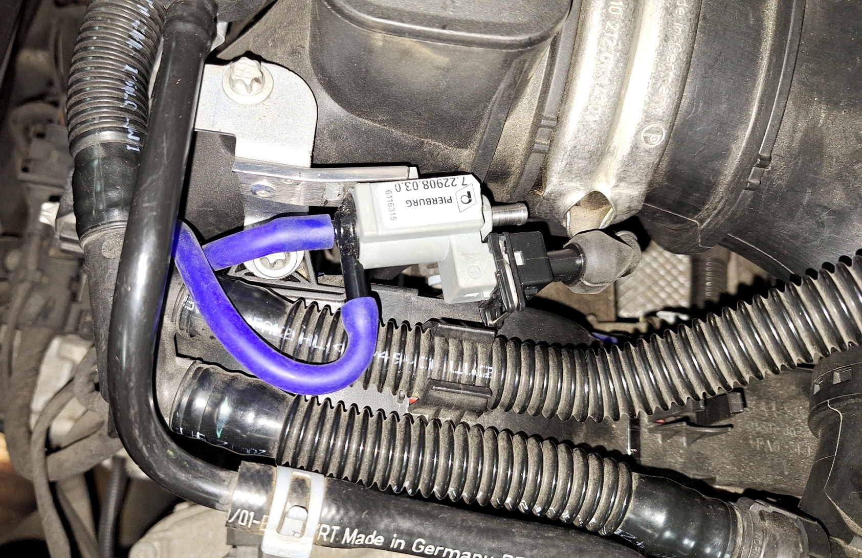 <= Sur le bas de cette électrovanne de commande de l'admission, on va se repiquer via un "T" sur le circuit à dépression, pour repartir via un nouveau tube vers la future électrovanne de commande du système d'échappement à valve PSE.