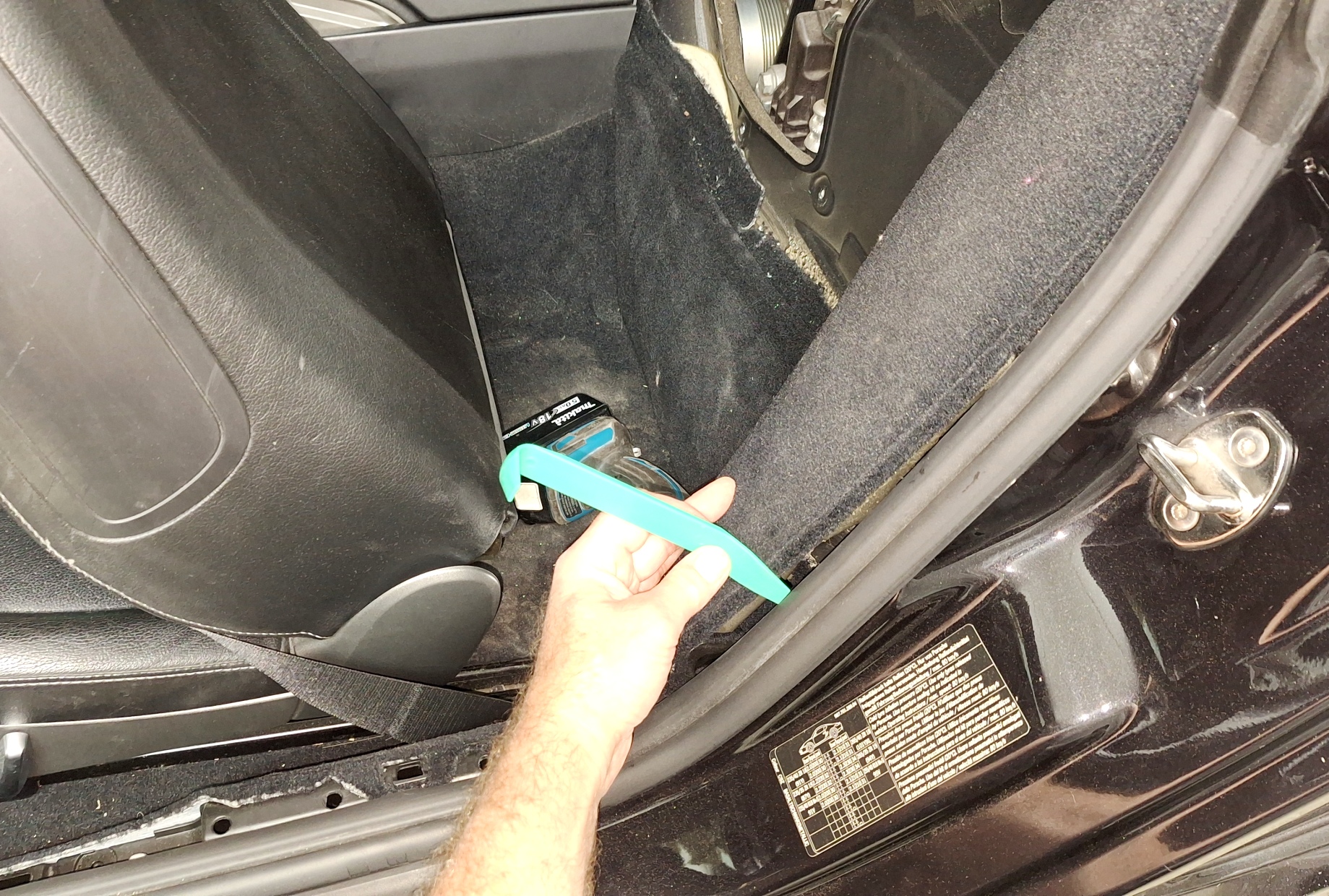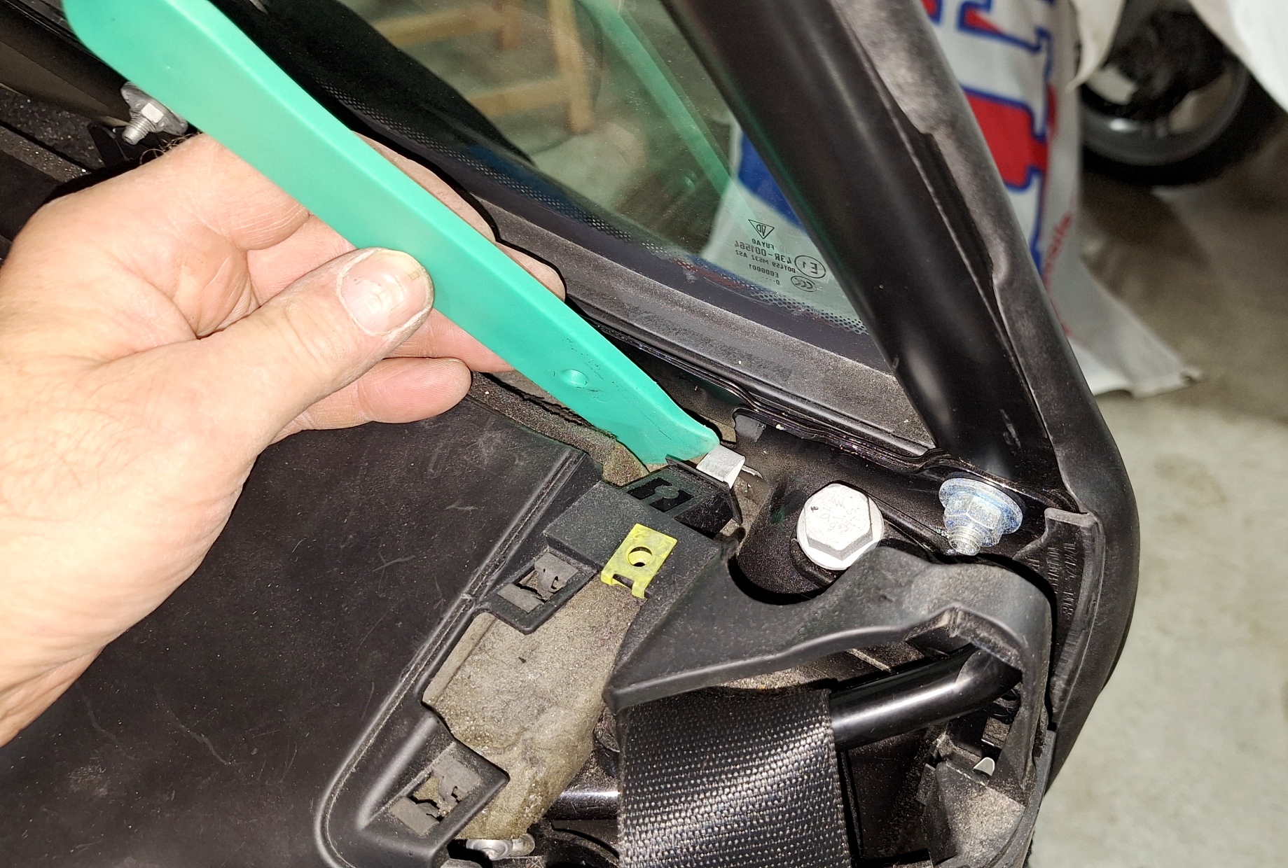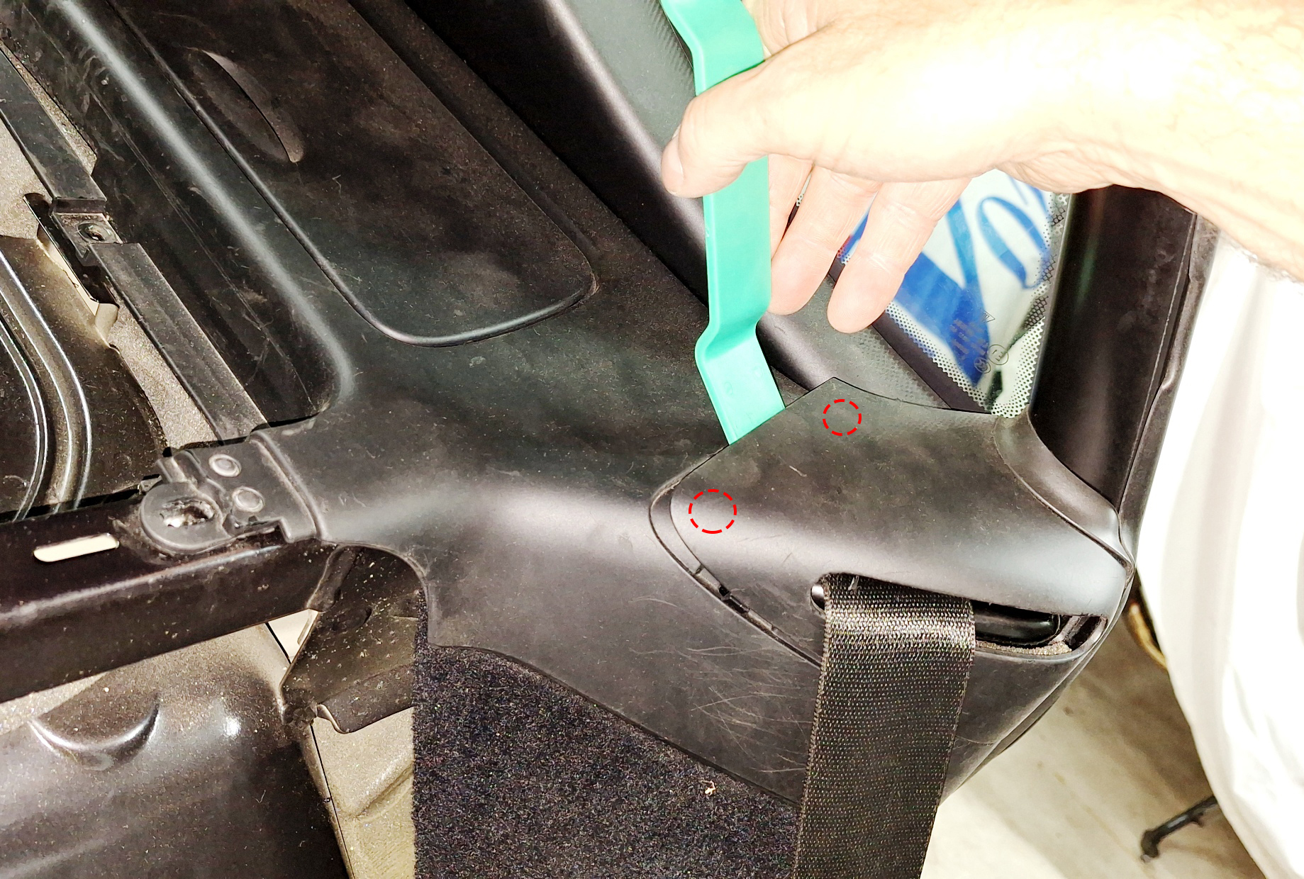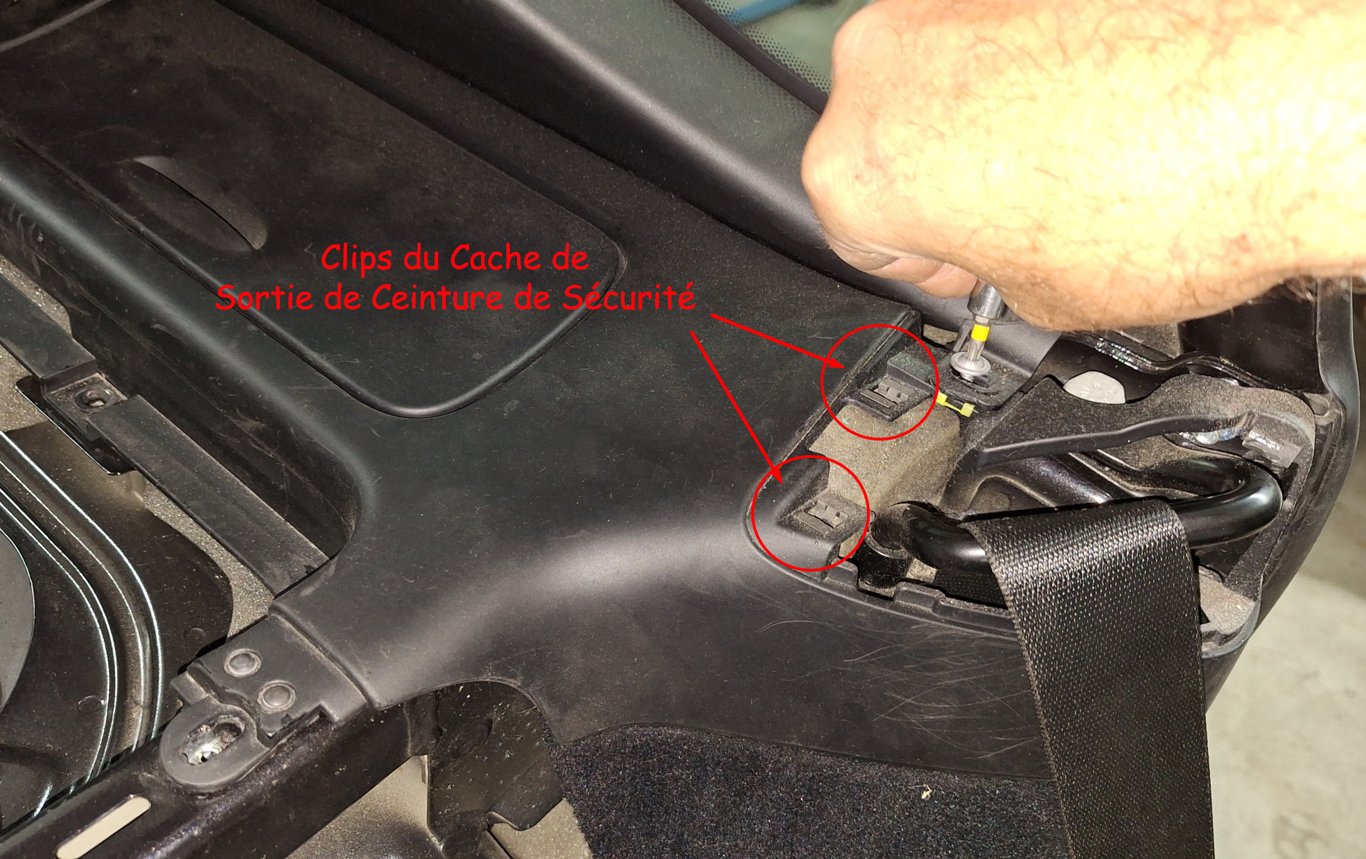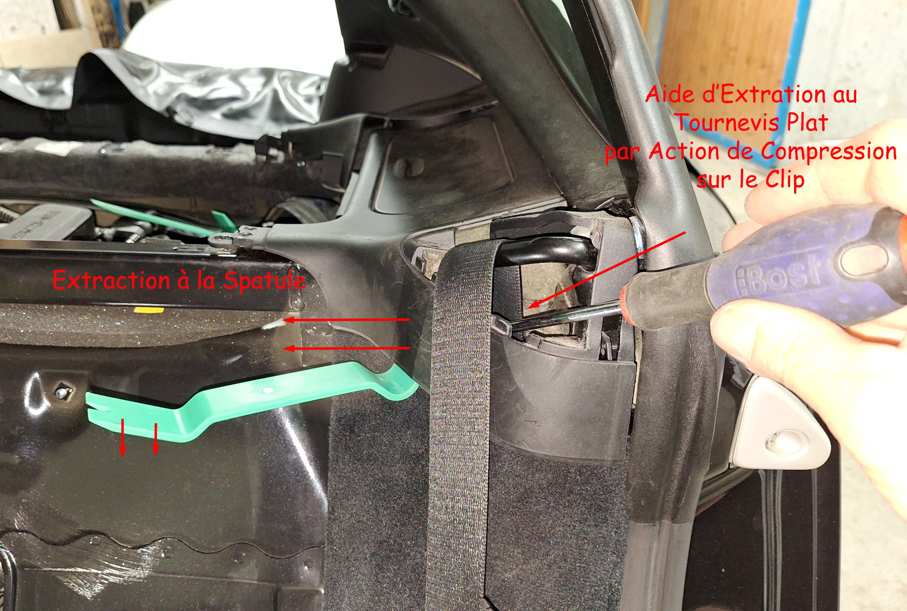 On dépose le cache d'accès au passage de la ceinture de sécurité. On insère la spatule entre les deux clips.
