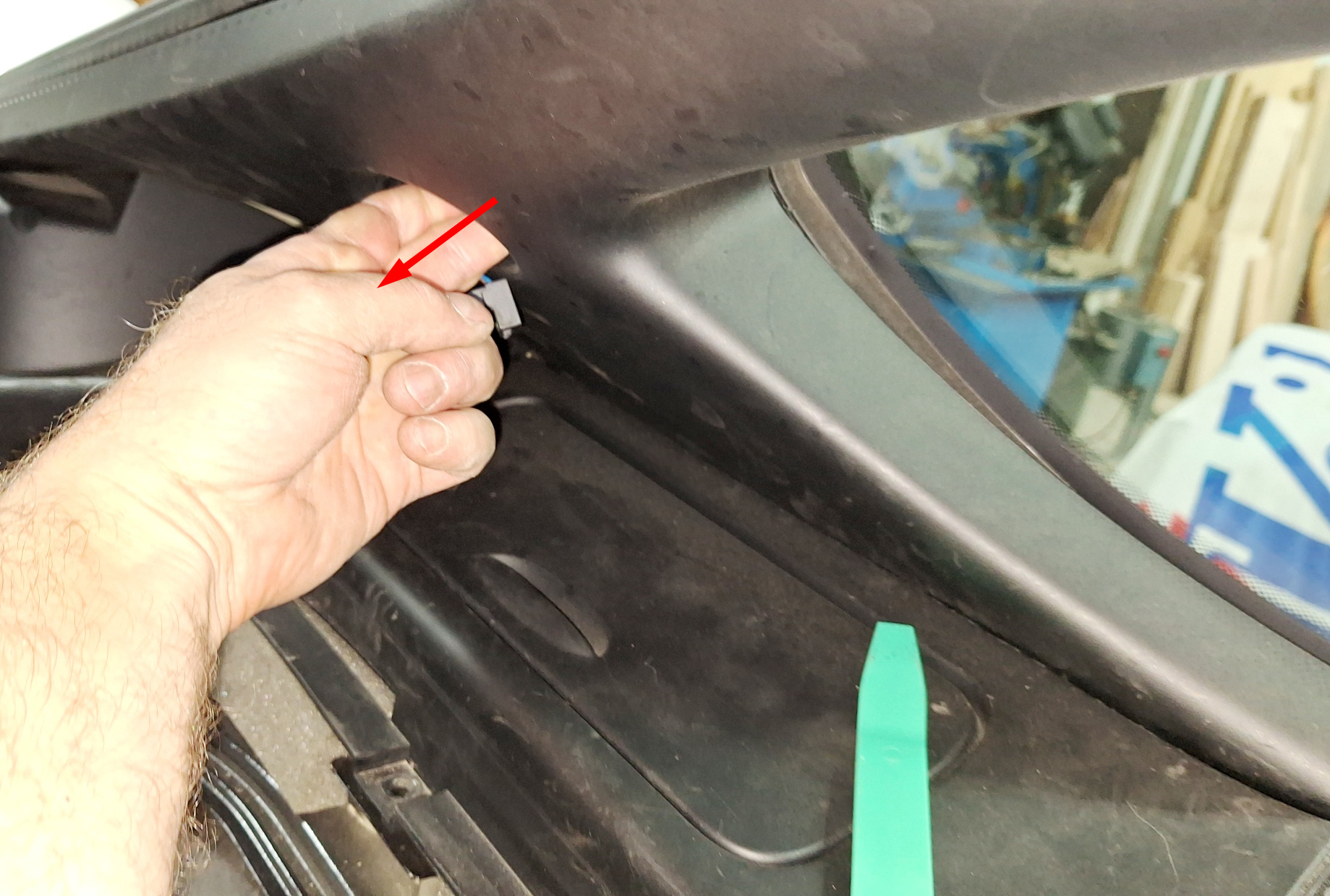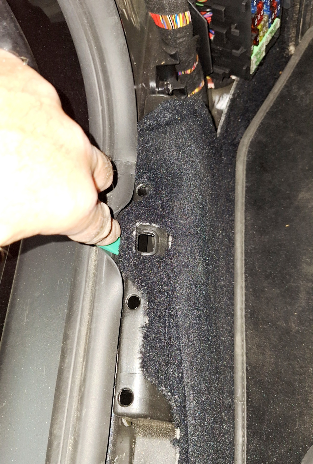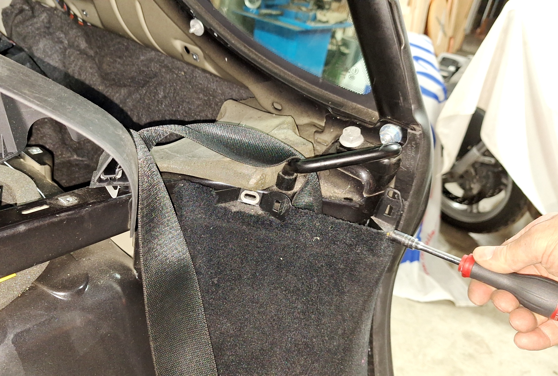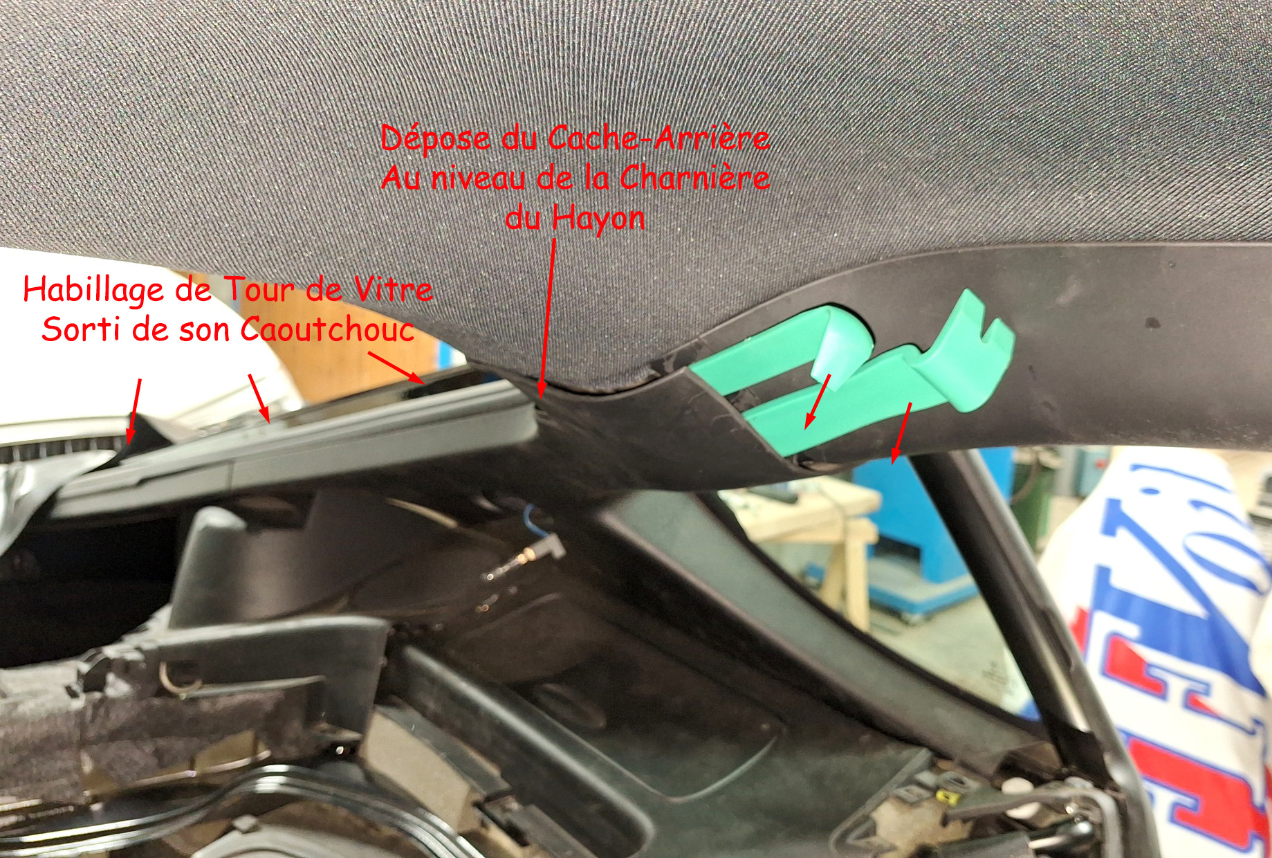 On libère l'habillage latéral de son caoutchouc au niveau du hayon arrière, ainsi que le petit cache en haut, vers la charnière de coffre (pas de photos de ça)
