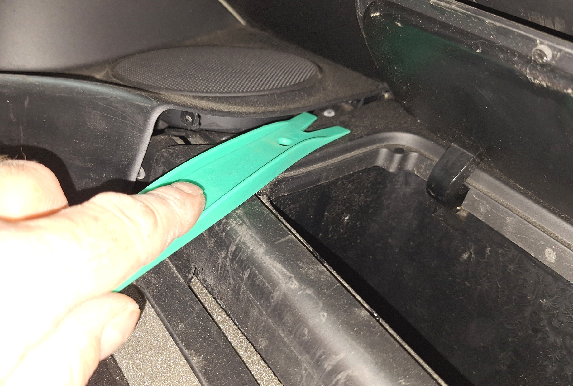 <= Un peu d'aide à la spatule. Mais on ne cherche pas encore à sortir le support du haut-parleur sans avoir complètement libéré la boîte à gant latérale.