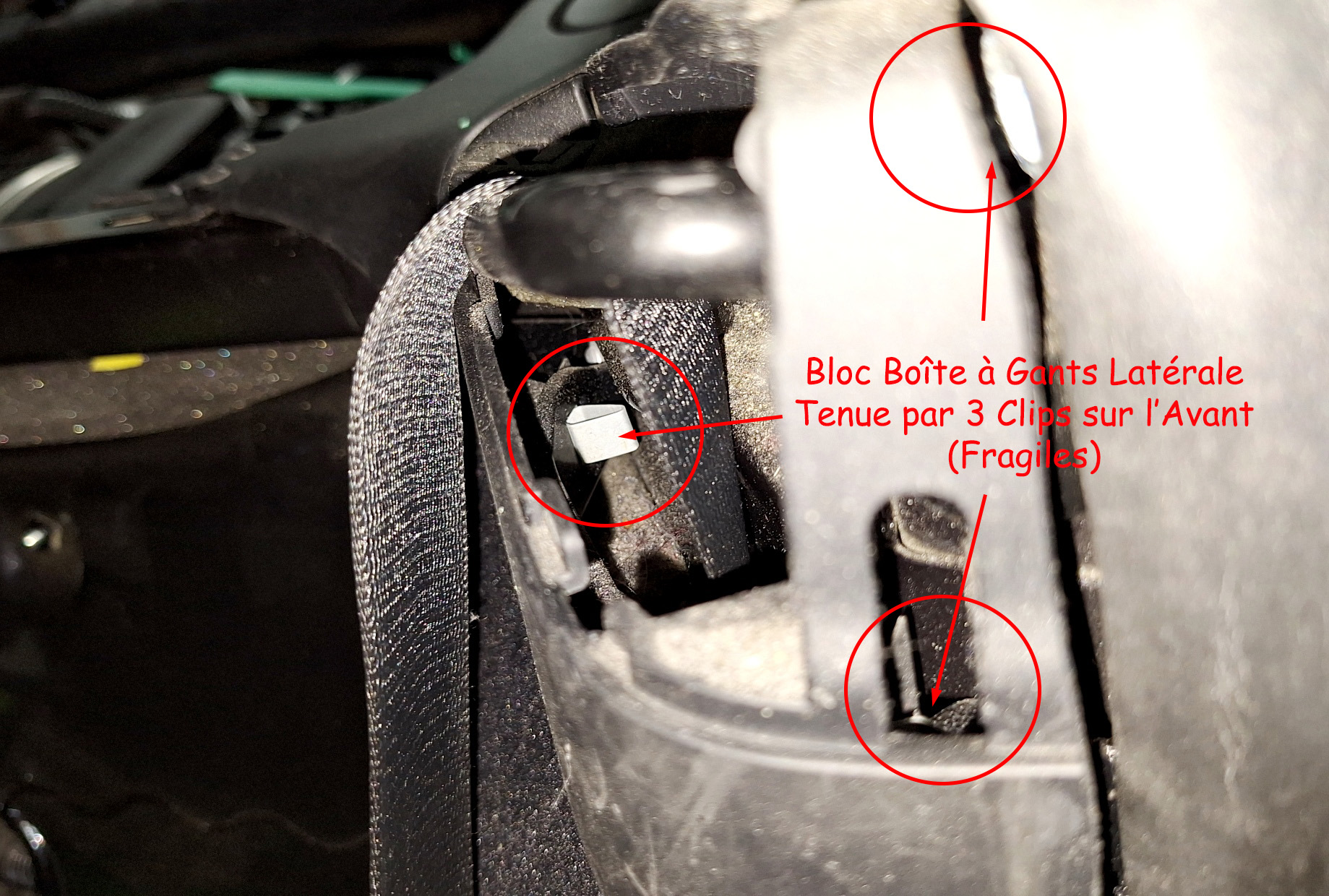 Et on va s'attaquer aux clips de la boîte à gants, on déclipse le bloc par l'avant, au niveau de la sortie de la ceinture de sécurité...