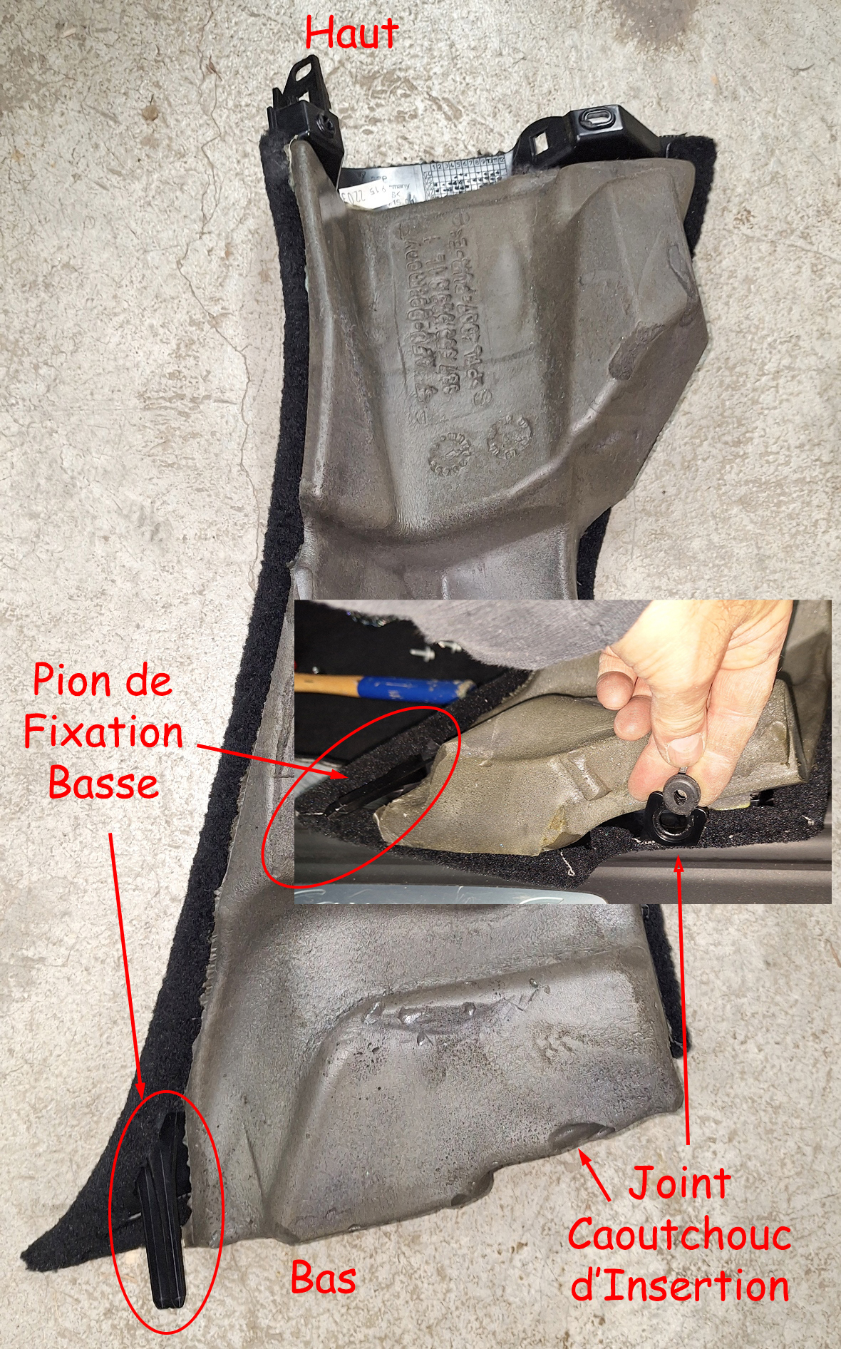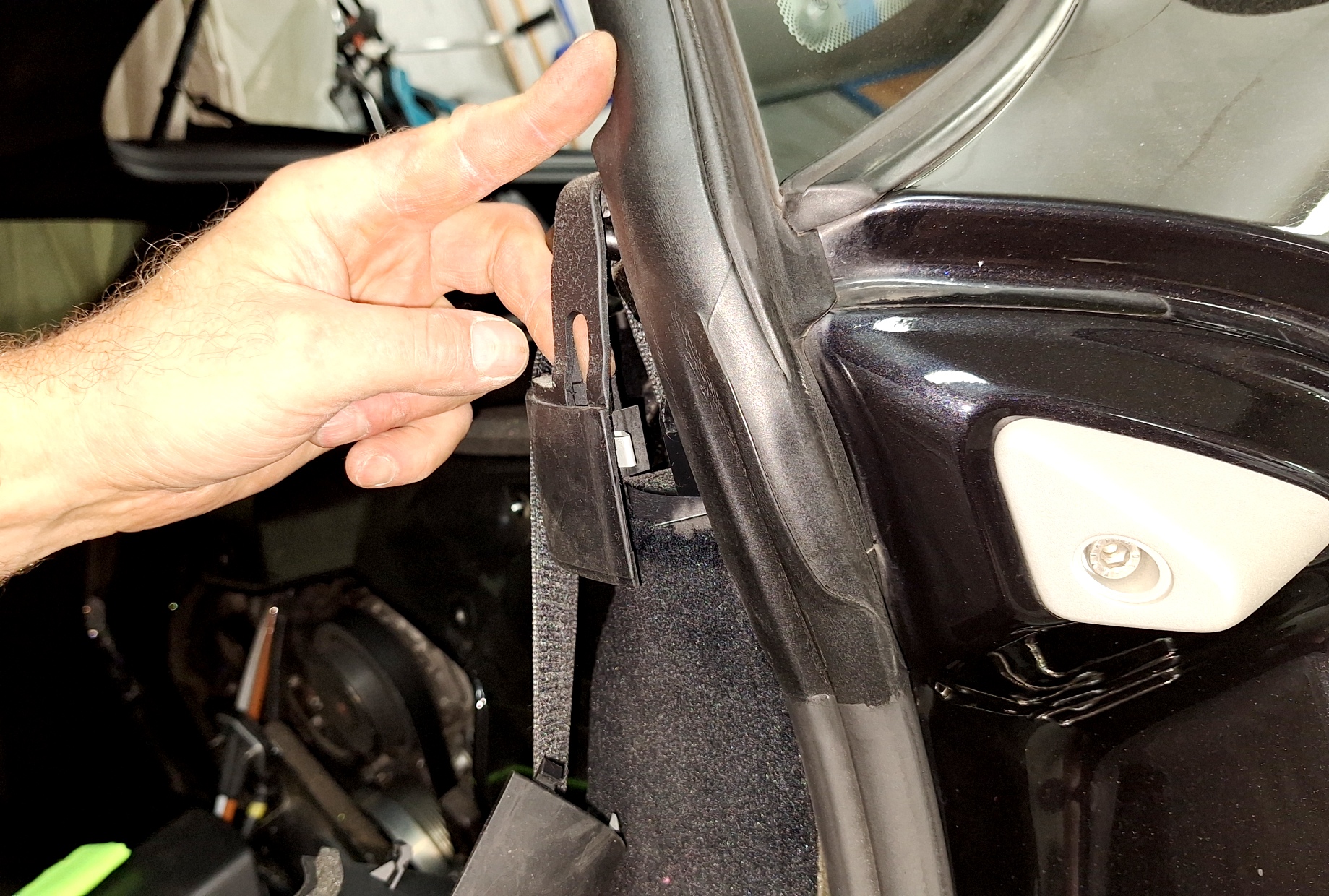 <= Dépose du petit joint de jonction sur le montant de porte. Ça fait partie des petits élément qu'on perd facilement.
